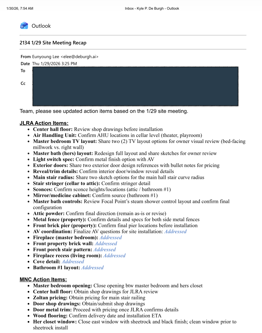 We’ve built a veritable Library of Alexandria: hundreds of top shelf document and email templates covering every aspect of our work. The collection is constantly expanding as we develop new tools for emerging use cases and refine existing ones. These documents are the backbone of our operations, supporting both internal De Burgh processes and external communication with team members and owners. They also serve as a database supporting internal AI automation, which saves time, and reduces costs—savings we pass on to our clients.